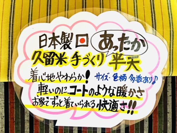 毎年大人気の「久留米織り 綿入り 手作り半天」!!