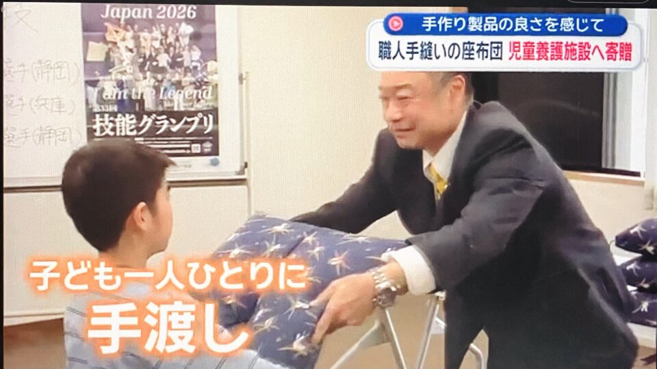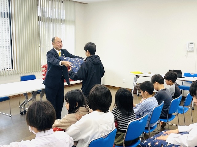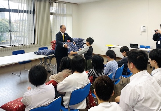 職人が、1から手縫いした座布団 16枚を、子ども一人ひとりに手渡しさせて頂きました!!